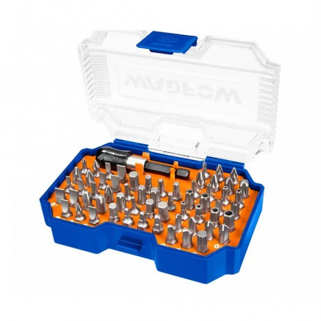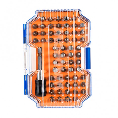 ชุดดอกไขควงที่ออกแบบมาเพื่อตอบโจทย์งานขันและไขสกรูที่หลากหลาย ตั้งแต่การประกอบเฟอร์นิเจอร์ไปจนถึงงานซ่อมบำรุงอิเล็กทรอนิกส์ ชุดนี้มีดอกไขควงความยาว 25 มม. รวม 61 ดอก ซึ่งครอบคลุมหัวสกรูมาตรฐาน เช่น แฉก (Phillips), แฉก Pozidriv (PZ), แบน (Slotted), ดาว (Torx) และหกเหลี่ยม (Hex) นอกจากนี้ยังมีดอกสำหรับสกรูนิรภัย (Tamper-Resistant) และสกรูเฉพาะทางอื่นๆ อีกด้วย มาพร้อมกับ ด้ามจับดอกไขควงแบบปลดเร็ว (Quick Release Bit Holder) 1 ชิ้น เพื่อความสะดวกในการเปลี่ยนดอกและเพิ่มความมั่นคงในการใช้งาน ดอกไขควงทั้งหมดผลิตจากเหล็ก Chrome Vanadium (CR-V) ซึ่งมีความแข็งแรงและทนทานต่อการสึกหรอ บรรจุในกล่องพลาสติกอย่างดีเพื่อความเป็นระเบียบและง่ายต่อการพกพา