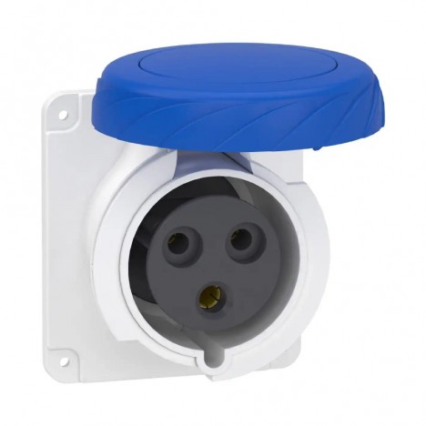 เต้ารับไฟฟ้าอุตสาหกรรมแบบติดตั้งฝังบนแผงควบคุม (Panel-mounted Socket) ในรูปแบบ ตรง (Straight) เต้ารับนี้ออกแบบมาเพื่อรองรับกระแสไฟฟ้าสูง 32 A สำหรับระบบไฟ 2P + E (เฟสเดียว + สายดิน) แรงดันไฟฟ้า 200-250 V AC (สีฟ้า) มีระดับการป้องกันน้ำและฝุ่นที่ IP67 (ป้องกันการจุ่มน้ำ) และความทนทานต่อแรงกระแทก IK08 เชื่อมต่อด้วยระบบ สกรูยึด (Screw terminals) เหมาะสำหรับติดตั้งในพื้นที่ที่ต้องเผชิญกับน้ำ ความชื้น หรือฝุ่นละอองอย่างรุนแรง ขณะที่ยังต้องการจ่ายไฟเฟสเดียวที่มีกระแสสูง