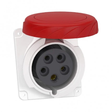เต้ารับไฟฟ้าอุตสาหกรรมแบบติดตั้งฝังบนแผงควบคุม (Panel-mounted Socket) ในรูปแบบ ทำมุม (Angled) จากกลุ่มผลิตภัณฑ์ Mureva PK หรือ PratiKa เต้ารับนี้รองรับกระแสไฟฟ้าสูงถึง 32 A สำหรับระบบไฟ 3P + N + E (3 เฟส + นิวทรัล + สายดิน) แรงดันไฟฟ้า 380-415 V AC (สีแดง) จุดเด่นคือมีระดับการป้องกันน้ำและฝุ่นที่ IP67 (ป้องกันการจุ่มน้ำ) และความทนทานต่อแรงกระแทก IK08 ออกแบบมาสำหรับงานอุตสาหกรรมขนาดกลางถึงขนาดใหญ่ที่ต้องการการจ่ายไฟฟ้า 3 เฟสที่เสถียรและปลอดภัยในสภาพแวดล้อมที่รุนแรง การเชื่อมต่อใช้ระบบ สกรูยึด