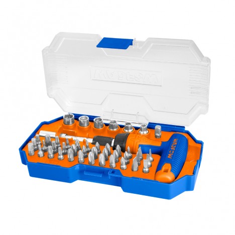 เป็นชุดเครื่องมือช่างพื้นฐานที่มีความหลากหลายและครอบคลุมงานไขและขันต่างๆ ได้อย่างมีประสิทธิภาพในชุดเดียว วัสดุหลักที่ใช้ในการผลิตคือ Chrome-Vanadium Steel (Cr-V) ซึ่งขึ้นชื่อเรื่องความแข็งแรง ทนทานต่อการสึกหรอ และอายุการใช้งานยาวนาน ชุดเครื่องมือนี้โดดเด่นด้วย ด้ามจับวงล้อตัว T (T-Ratchet Handle) ที่ออกแบบมาเพื่อช่วยเพิ่มแรงบิดในการขันและคลายสกรูหรือน็อตต่างๆ ได้ง่ายขึ้น ทำให้ผู้ใช้สามารถออกแรงได้สะดวกและมีการควบคุมที่ดีขึ้น อุปกรณ์ในชุดประกอบด้วยดอกไขควงหลายรูปแบบถึง 36 ชิ้น (เช่น ปากแบน, แฉก Phillips, แฉก Pozidriv, หัวดาว Torx, และหกเหลี่ยม Hex) และลูกบ็อกซ์อีก 6 ชิ้น ครอบคลุมการใช้งานที่หลากหลายทั้งหมดถูกจัดเก็บไว้อย่างเป็นระเบียบใน กล่องพลาสติก เพื่อความสะดวกในการพกพาและจัดเก็บ