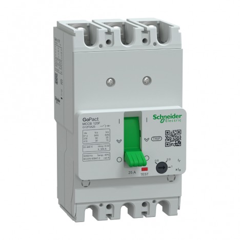 SCHNEIDER G12F3A25 คือเซอร์กิตเบรกเกอร์แบบมีเปลือกหุ้ม (Molded Case Circuit Breaker: MCCB) ในตระกูล GoPact MCCB 125 ชนิด 3 โพล (3P) สำหรับระบบไฟฟ้า 3 เฟส มีพิกัดกระแสใช้งาน 25A (แอมแปร์เฟรม 125A) และโดดเด่นด้วยพิกัดกระแสลัดวงจรสูงสุด (Icu) ที่ 30kA ที่ 415VAC ชุดทริปเป็นแบบ Thermal-Magnetic (TMD) ที่สามารถ ปรับตั้งค่ากระแสเกิน (Ir) ได้ (0.8 ถึง 1 เท่าของ In) เป็นเบรกเกอร์ประสิทธิภาพสูงสำหรับวงจรโหลดขนาดเล็กถึงปานกลาง ที่ตั้งอยู่ในสภาพแวดล้อมที่ต้องการความสามารถในการตัดกระแสลัดวงจรที่สูง
