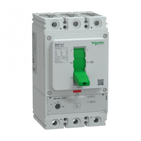 SCHNEIDER G40F3A400 คือ เซอร์กิตเบรกเกอร์แบบโครงสร้างหล่อ (Moulded Case Circuit Breaker - MCCB) ชนิด 3 โพล (3P) ในกลุ่มผลิตภัณฑ์ GoPact MCCB 400 ซึ่งมีขนาดเฟรมและพิกัดกระแสสูงสุดที่ 400A มีความสามารถในการตัดกระแสลัดวงจรสูงสุด 36 kA ที่ 415 V AC 50/60 Hz มาพร้อมกับหน่วยปลดวงจรแบบ Thermal-Magnetic (TMD) ที่สามารถปรับค่ากระแสป้องกันความร้อนในระยะยาวได้ เป็นเบรกเกอร์ประสิทธิภาพสูงที่ใช้สำหรับการป้องกันวงจรไฟฟ้าหลักในตู้จ่ายไฟขนาดใหญ่